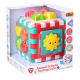 Veselá farebná kocka s množstvom skvelých aktivít na zlepšovanie motorických vlastností. Každá strana obsahuje inú aktivitu, napr. hrkálku, zrkadielko, číslice a rôzne iné aktivity. S kockou je možné hrať sa v rozloženom aj poskladanom stave. Rozmery 18,5 x 18,5 x 18,5 cm.